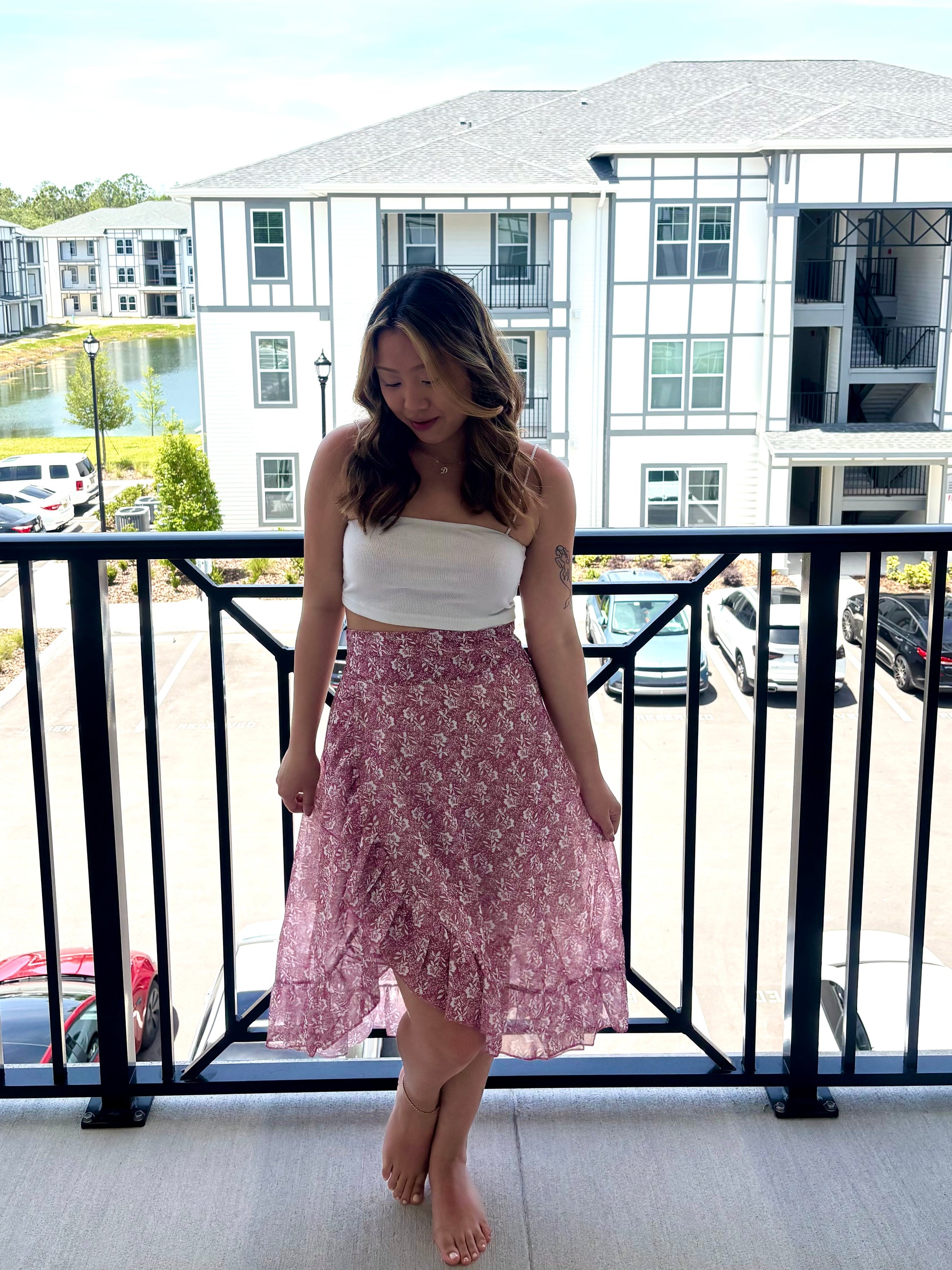 Our Daisy Maxi Skirt is an asymmetric, pink floral skirt with ruffles on the lining of the dress. It's fun & girly for the people who like outfits with dimension. A great piece to wear for a walk on the beach or a vacation outfit to wear for your best travel pictures.